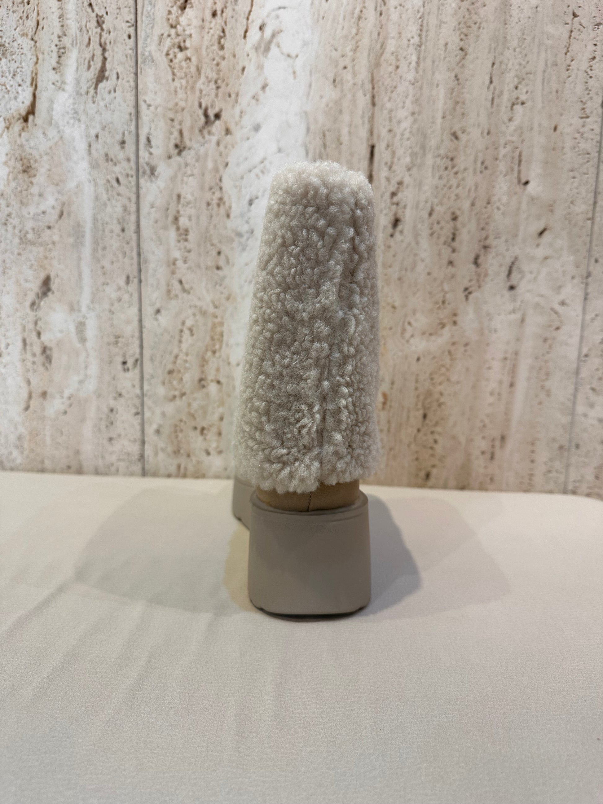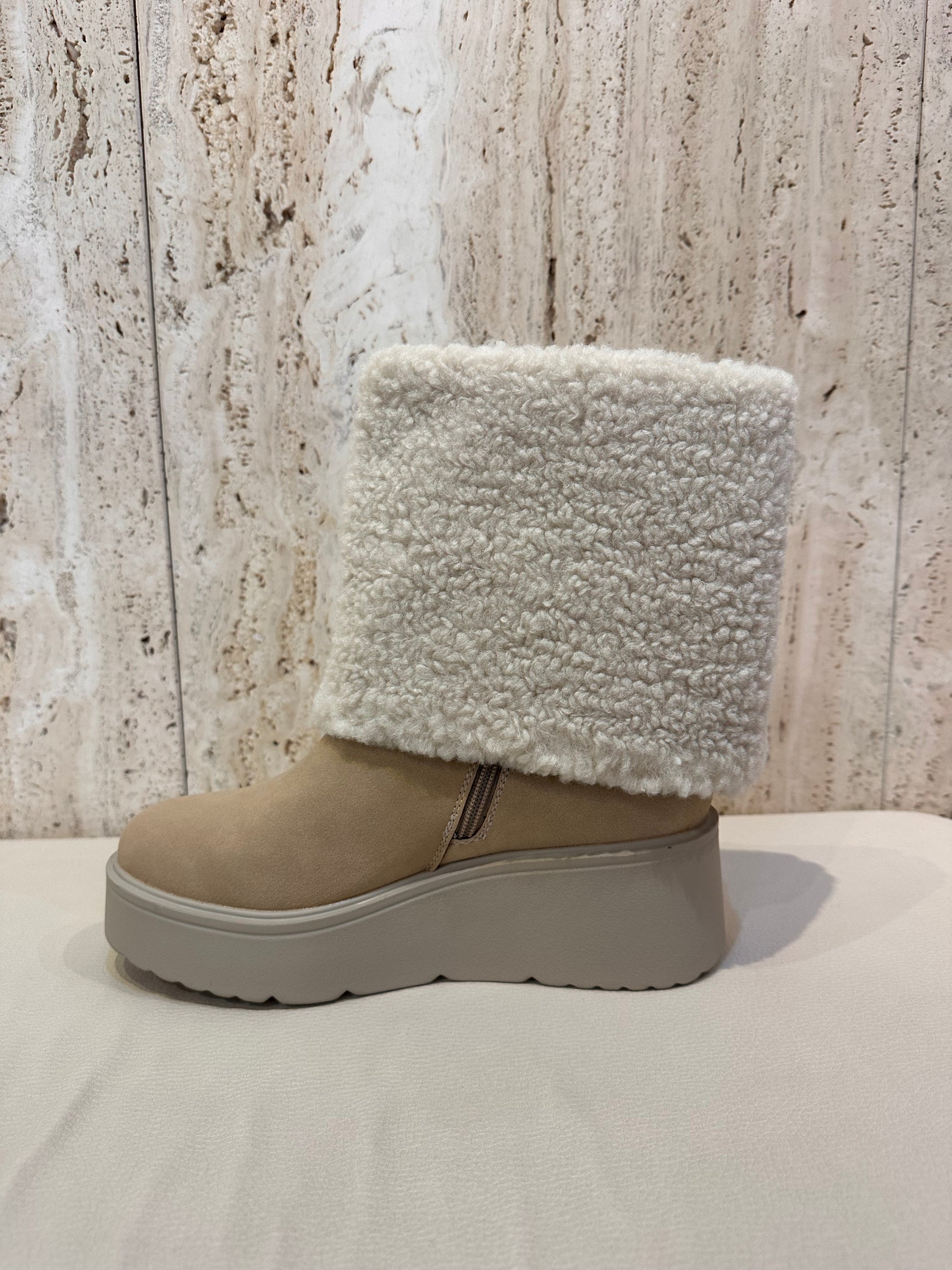 Bota convertible a botín con pelo y borreguito en color camel y hielo