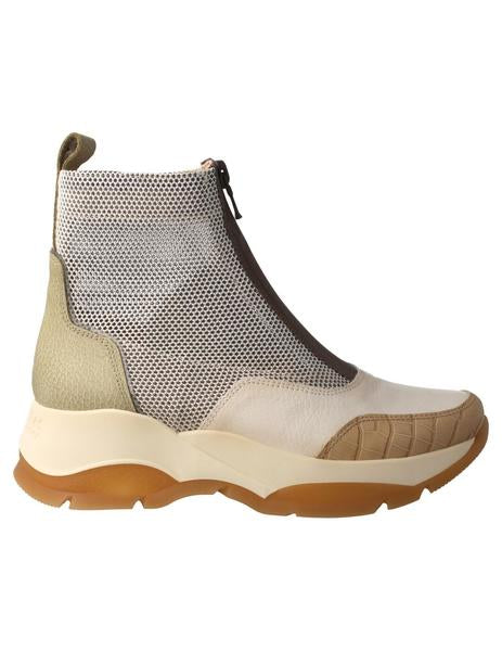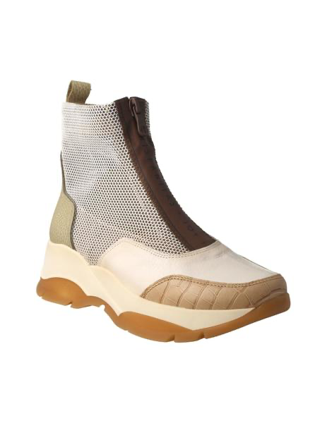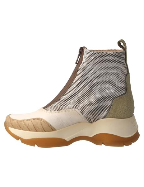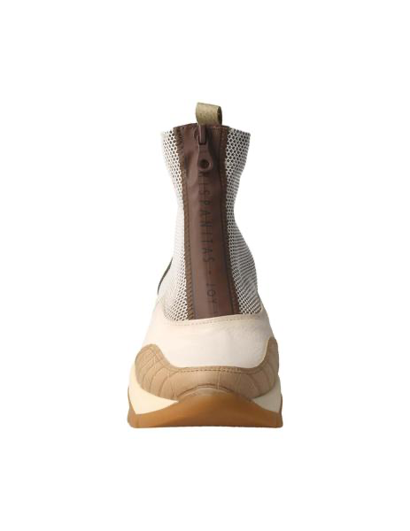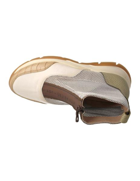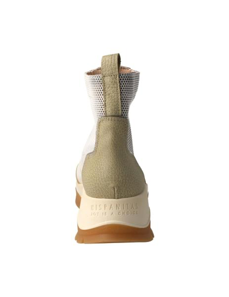 Botín de mujer Hispanitas fabricado en una combinación de textil y piel en tonos naturales, beige, arena y cacao. Plantilla de piel extraible. Suela de goma de 5 centimetros. Cierre de cremallera delantera.