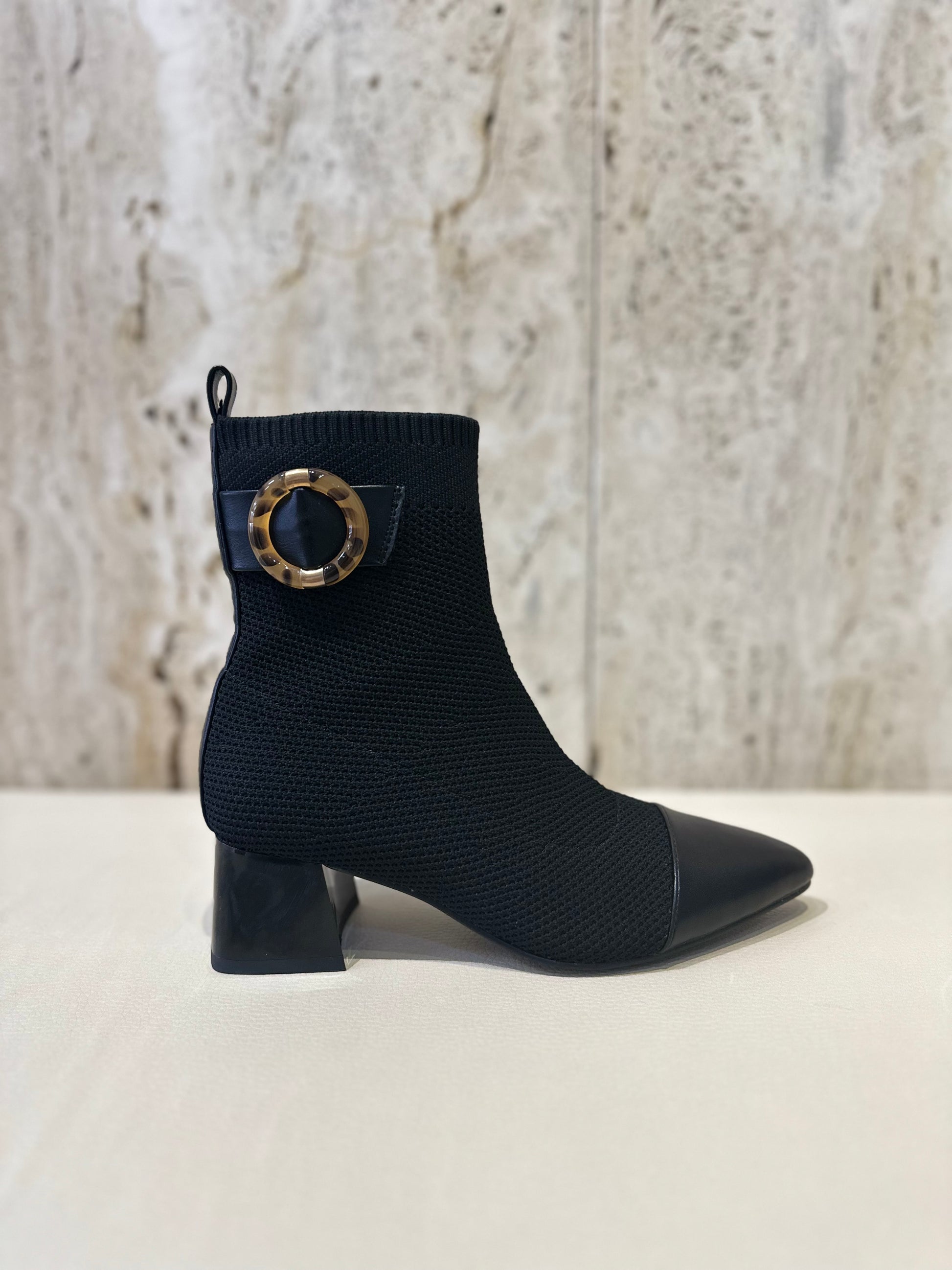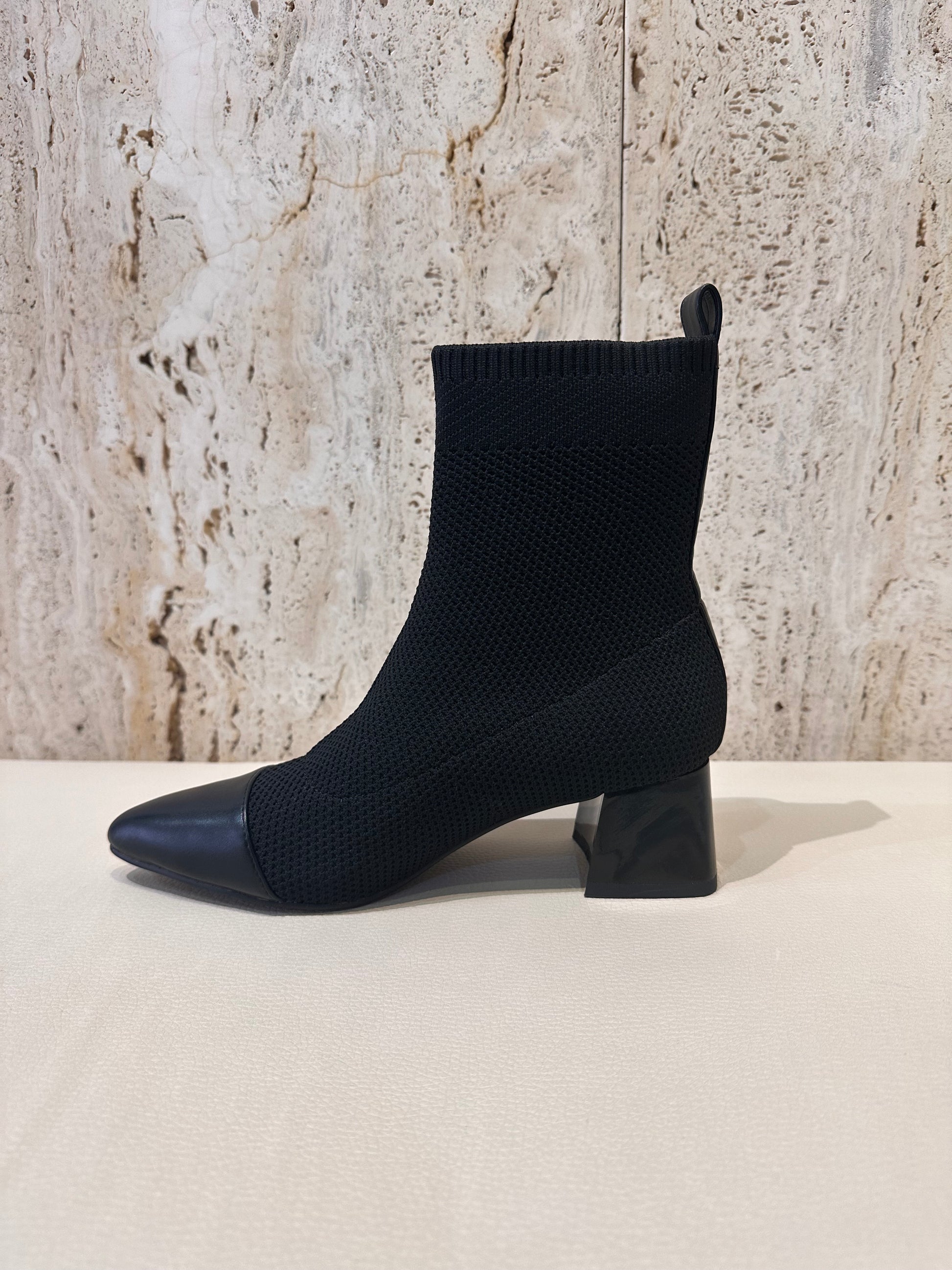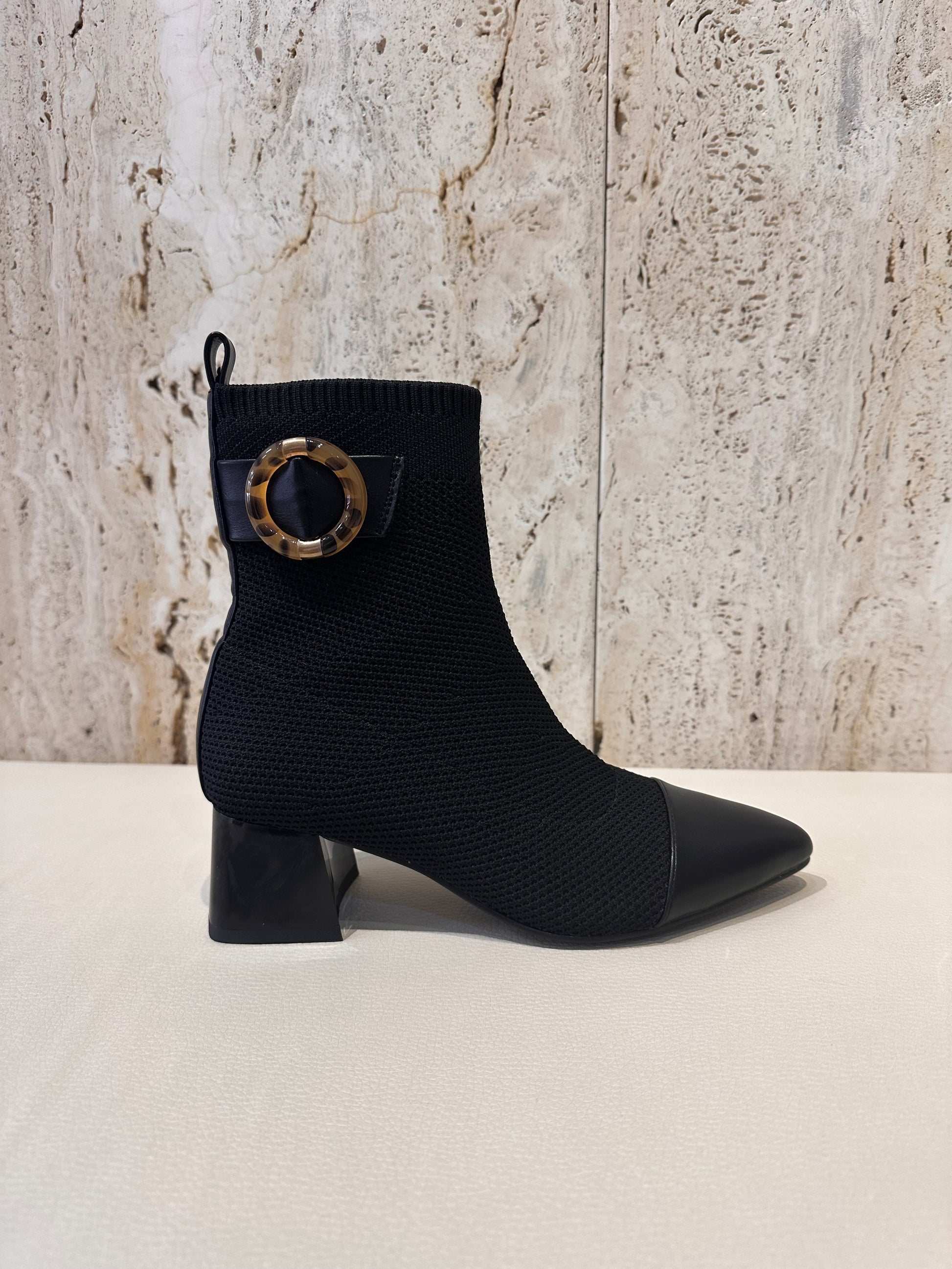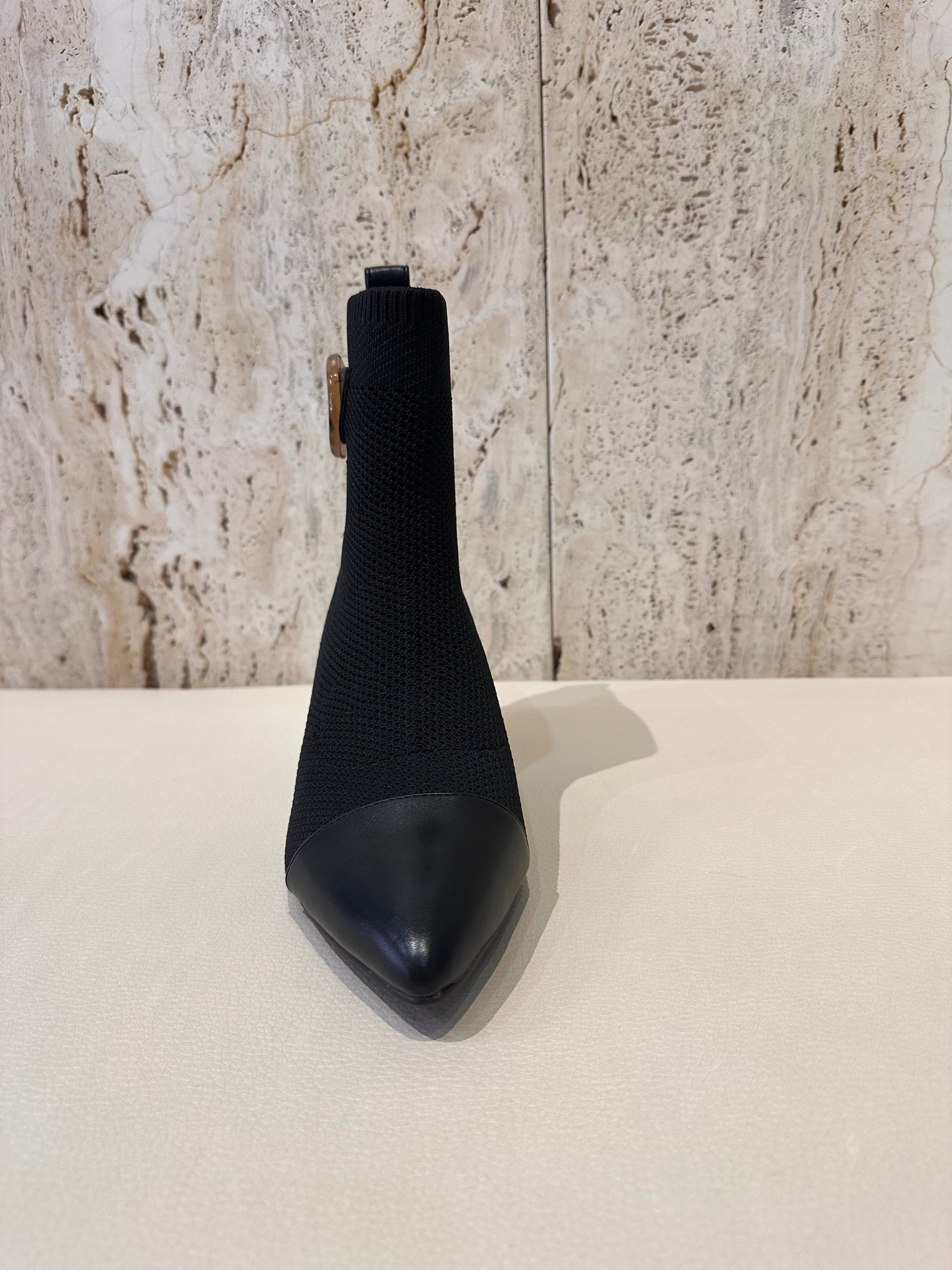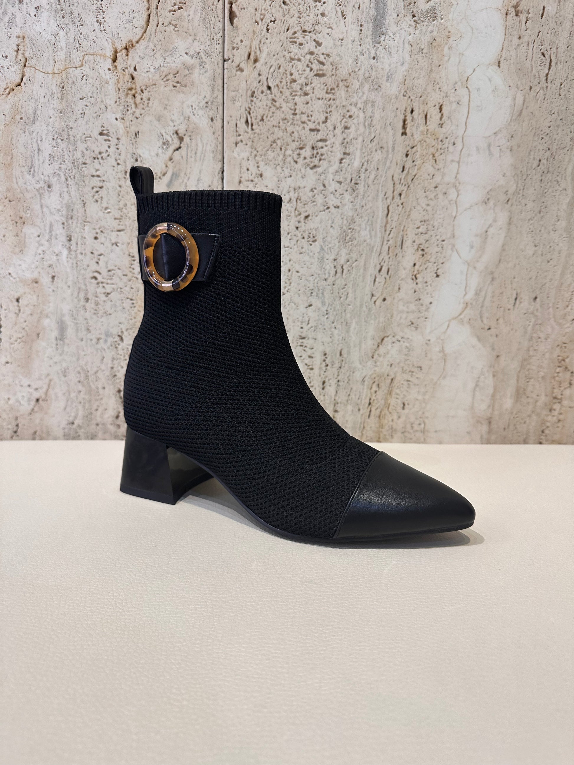 Botín de tacón estilo calcetín (licra) en color negro con adorno.