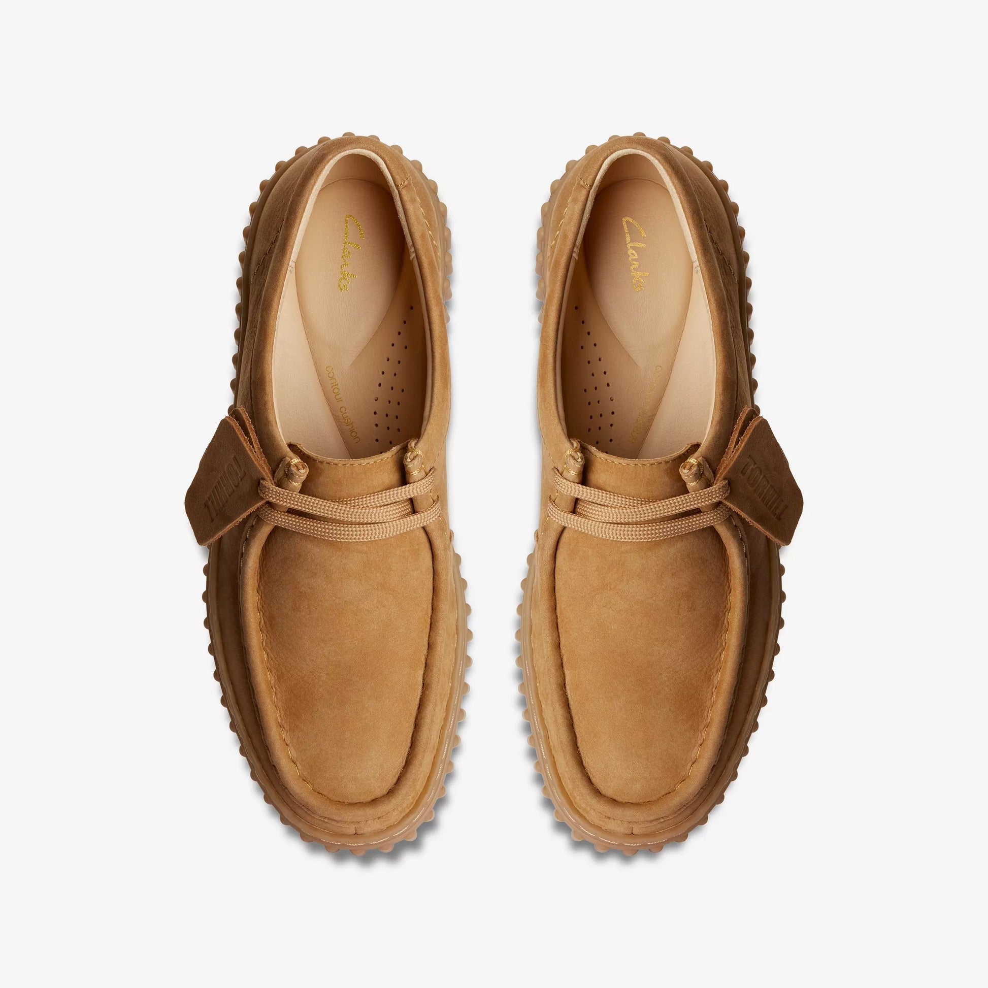 Wallaby Clarks en piel nobuck marrón tostado claro y negro.