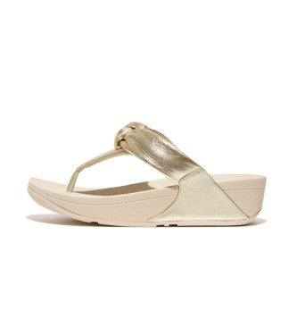 Sandalia esclava de la marca Fit Flop en color platino. Empeine triangular en piel metalizada con detalle de nudo. Diseñada con entresuela Microwobbleboard de triple densidad para una mejor amortiguación. Elegantes y sumamente cómodas