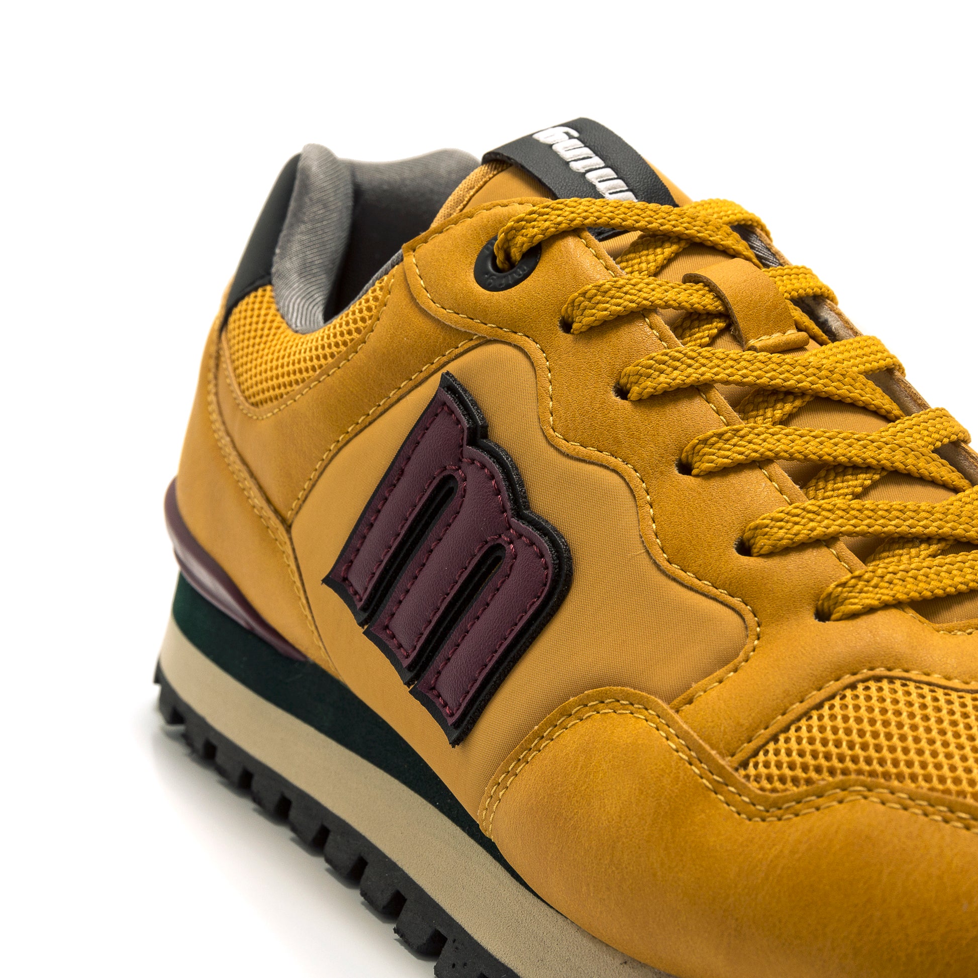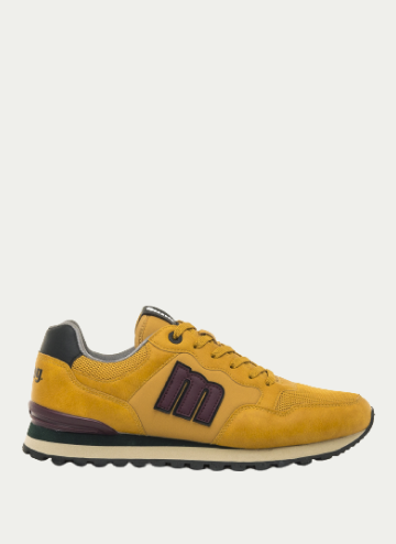 Zapatilla deportiva Joggo Track Mustang para hombre. Original diseño de color mostaza en piel sintética. Detalles en color burdeos y azul marino. Logo de la marca en el lateral y nombre en la trasera. Paneles con textura de malla. Cierre de cordones planos al tono. Suela dentada. Le darán el toque de originalidad extra que tus looks diarios estaban esperando.