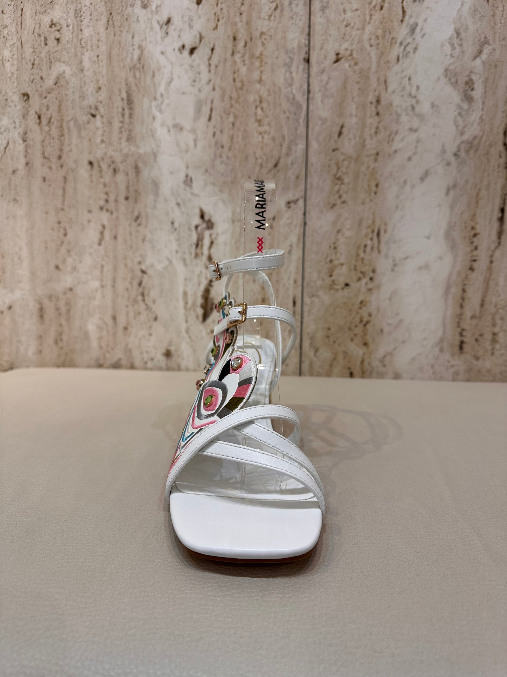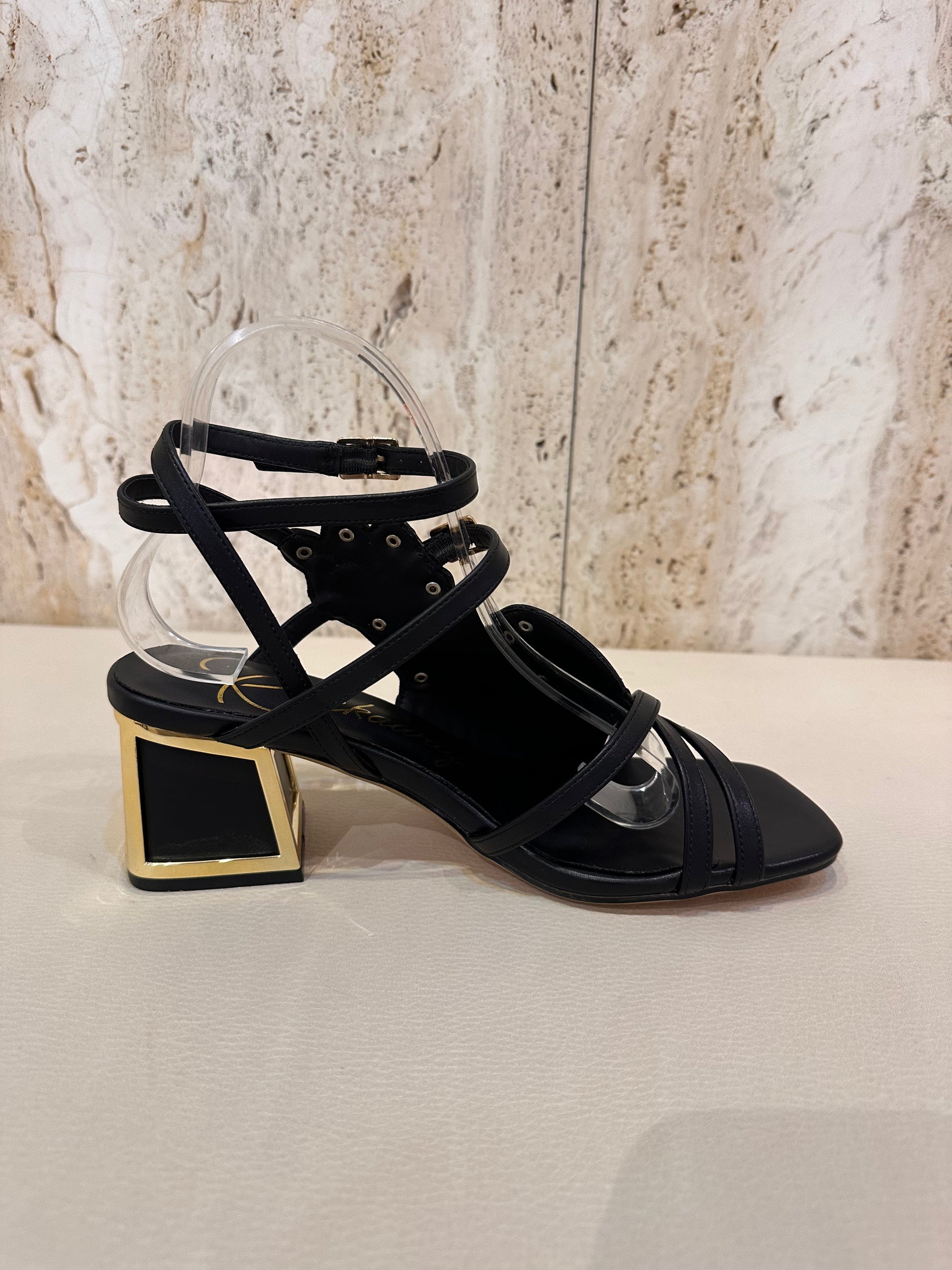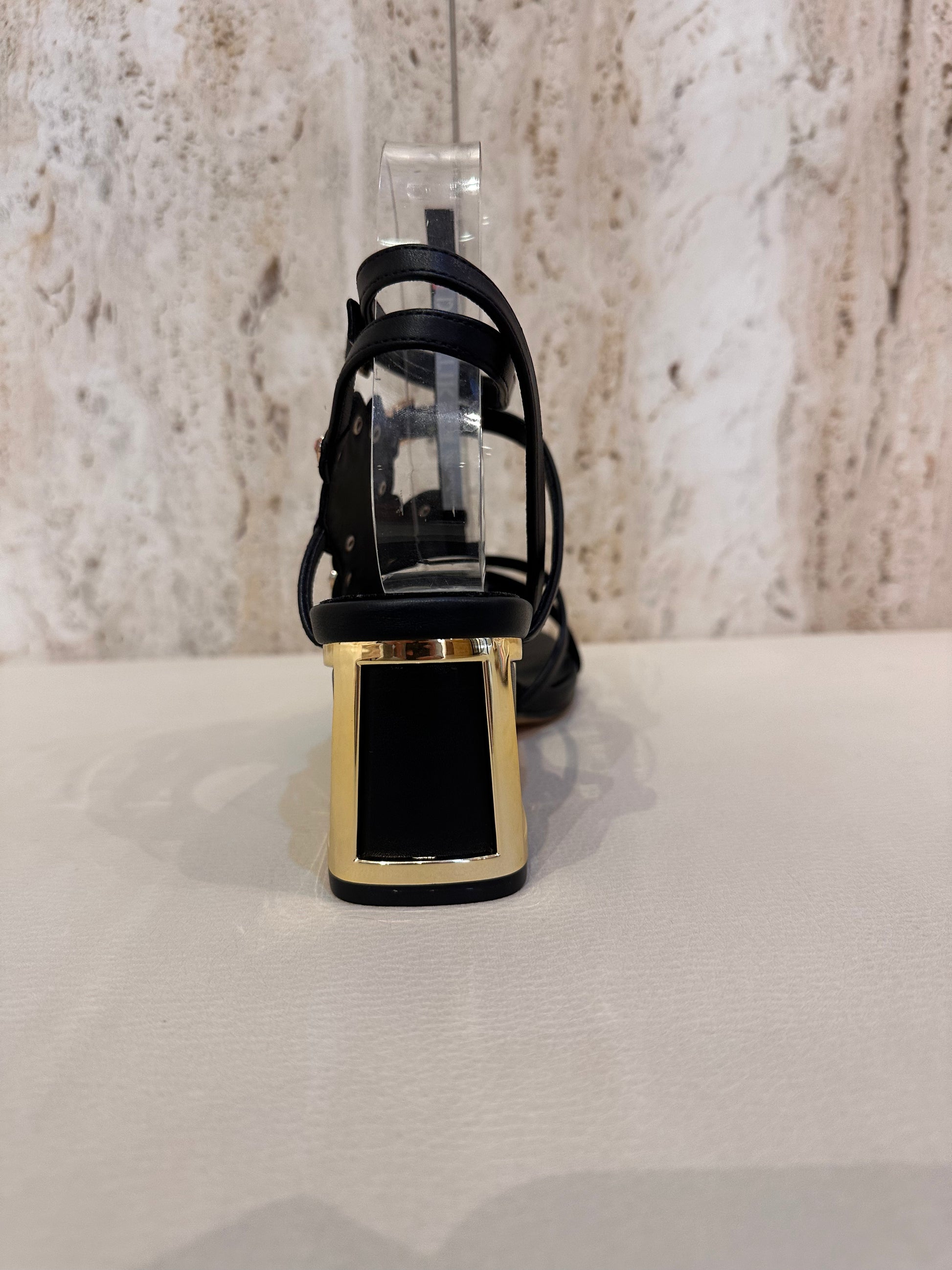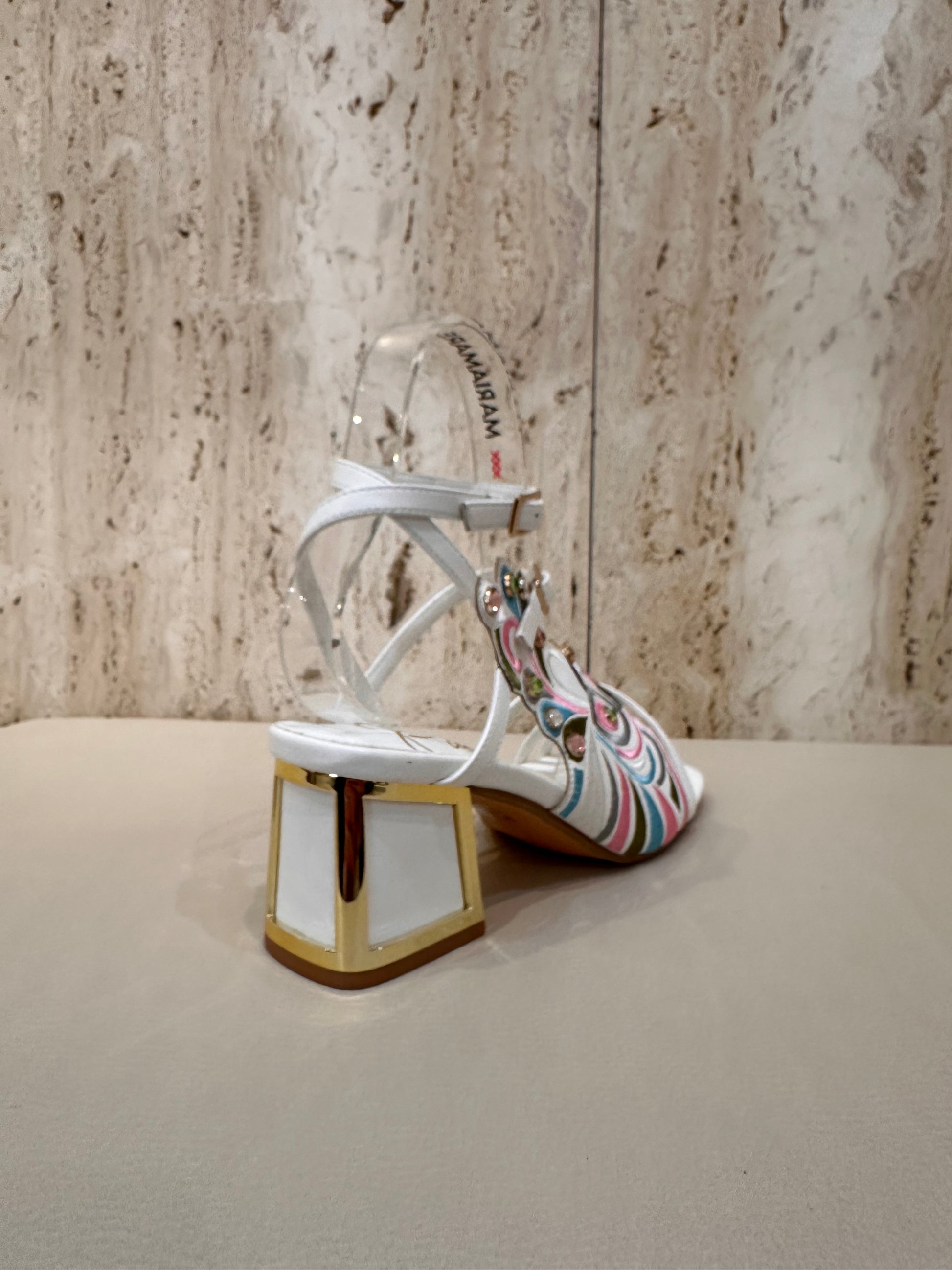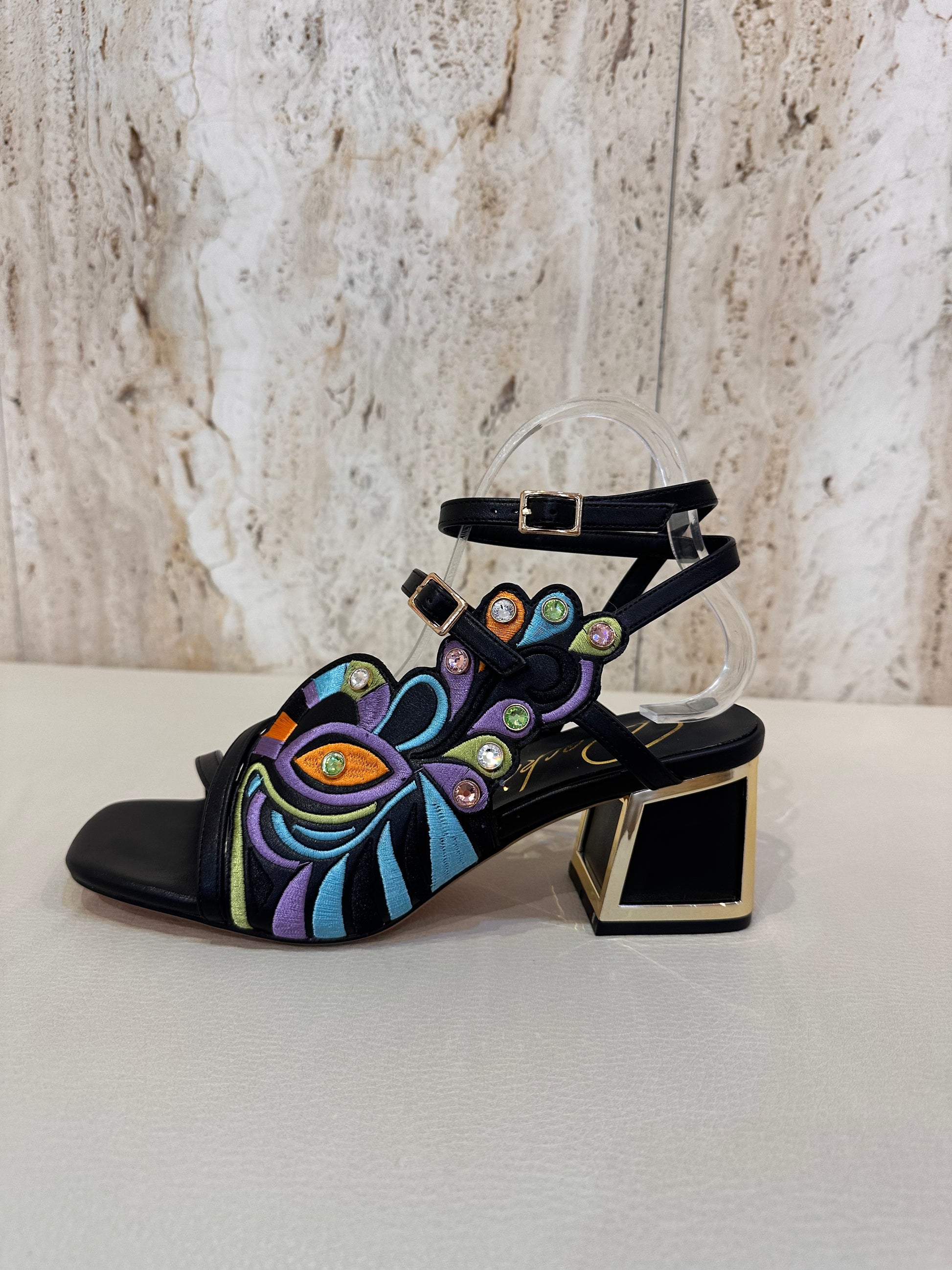 Sandalia de tacon muy original en color negro predominante y diversidad de colores multicolor