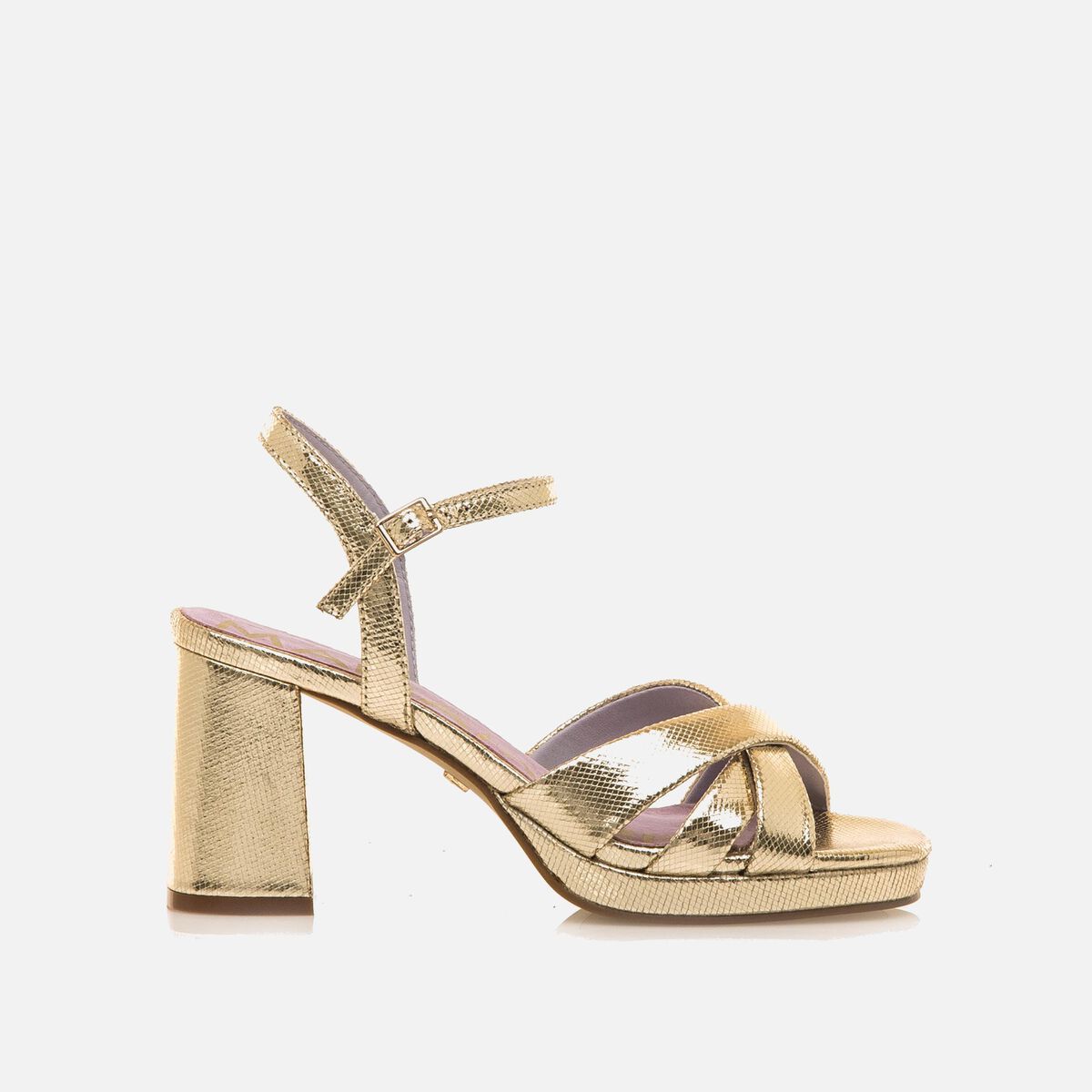 Sandalias de tacón y plataforma para mujer 68647 , modelo Cefalu de color champagne, marca Mariamare. Este modelo resalta por su acabado metálico con textura que añade un toque llamativo y glamuroso. Las tiras cruzadas en la parte delantera aportan estilo, mientras que la pulsera ajustable al tobillo garantiza un ajuste cómodo y seguro. El tacón ancho proporciona estabilidad, siendo perfectas para eventos especiales o celebraciones.