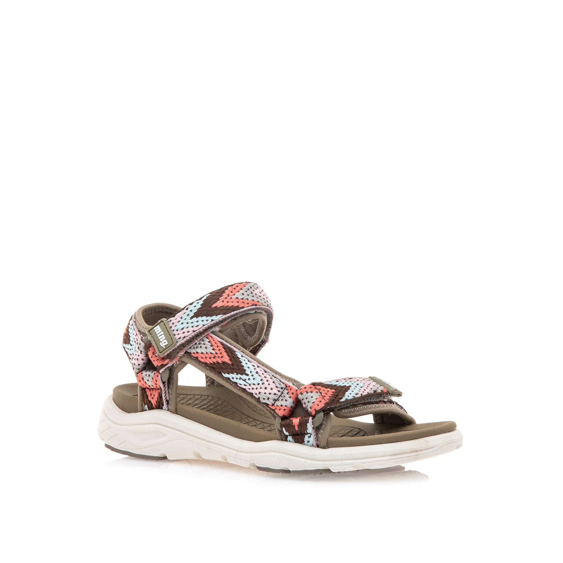 Sandalia multicolor Tornado para mujer de la marca Mustang. Destaca por su estampado con diseño étnico en tonos rosa, fucsia y azul claro. Cuenta con correas ajustables adhesivas, y una suela gruesa de color blanco, además de una planta kaki que contrasta con su llamativo estampado. ¡Encuentra la versatilidad y el estilo en Tornado de Mustang!