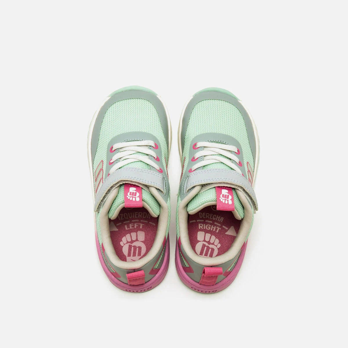 Zapatilla barefoot Mustang Free para niña en verde aguamarina con detalles rosa. Diseñada con el Dr. Juanjo López para respetar el desarrollo natural del pie infantil. Puntera ancha que permite libre movimiento de dedos, cordones elásticos y cierre adherente para fácil calce. Plantillas extraíbles y apertura amplia para autonomía del niño. Lavable, con suela degradada y certificado vegano INESCOP.
