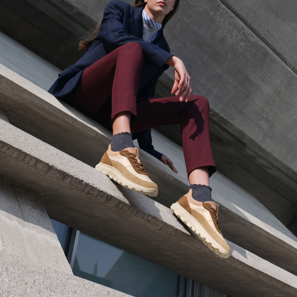 Deportiva para mujer de diseño contemporáneo con un sistema que permite un calce rápido sin utilizar las manos, garantizando una gran comodidad a la hora de caminar. En esta versión beige y marrón, está realizada en suave napa adornada con detalles de ante para un aspecto sofisticado y versátil. Spherica™ Plus ofrece una excelente amortiguación que proporciona un impulso extra a cada paso, ideal para un estilo de vida urbano y dinámico.