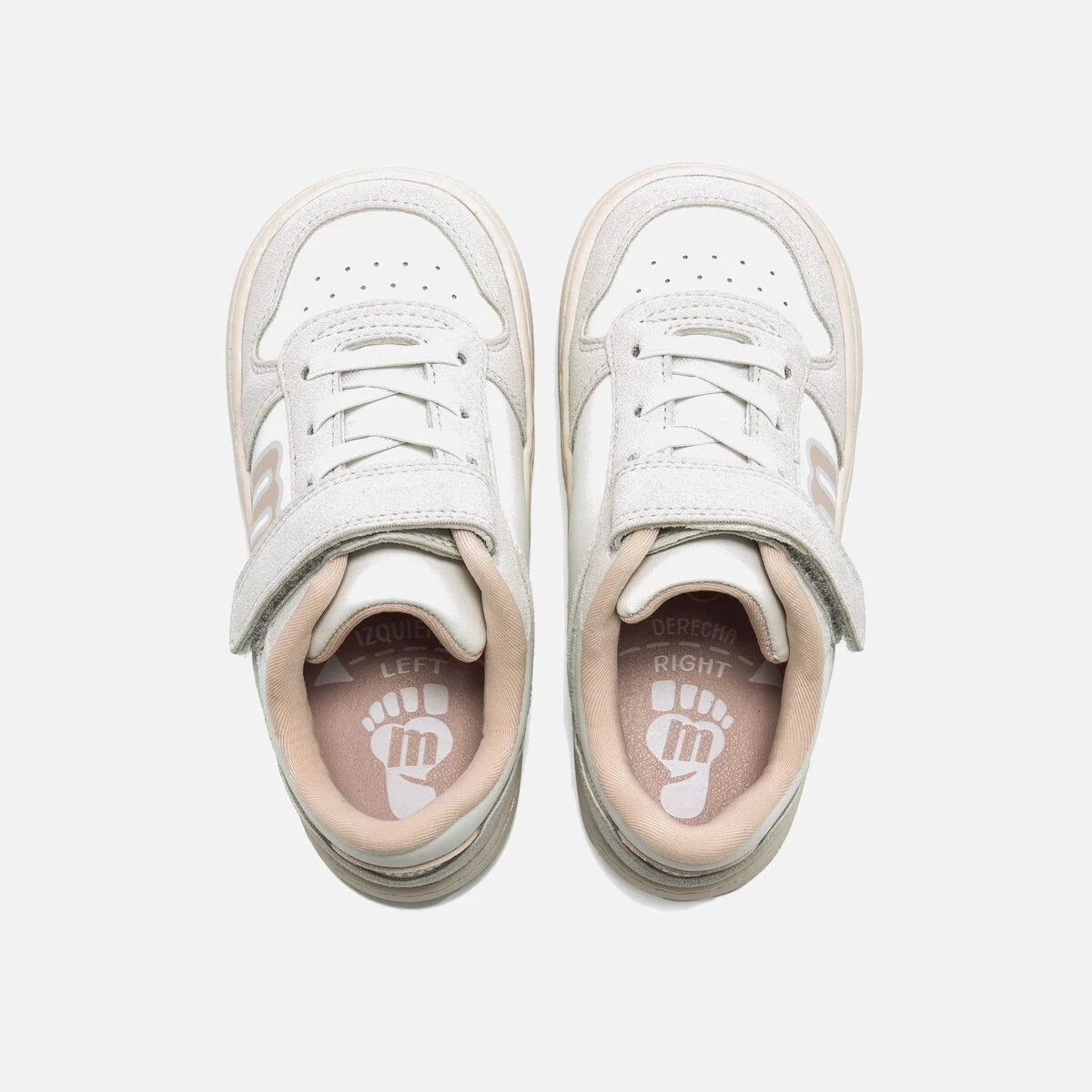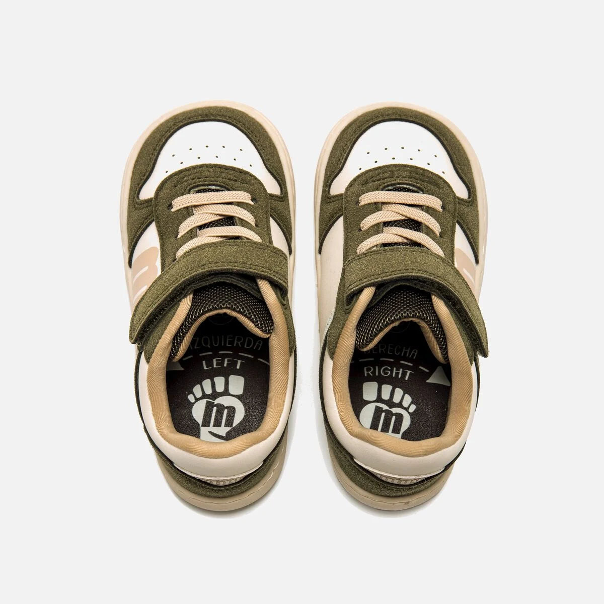 Zapatillas blancas con detalles beige y verde para niños, que combinan estilo y comodidad. Cierre adhesivo y cordones elásticos facilitan ponerlas y quitarlas solos. Su puntera ancha y suela plana de 3 mm permiten un movimiento natural del pie. Diseño pensado con el Dr. Juanjo López para cuidar el desarrollo infantil. Plantillas extraíbles ayudan a comprobar la talla y el certificado VEGANO confirma que son libres de materiales animales. Perfectas para acompañar los primeros pasos con libertad y confianza.